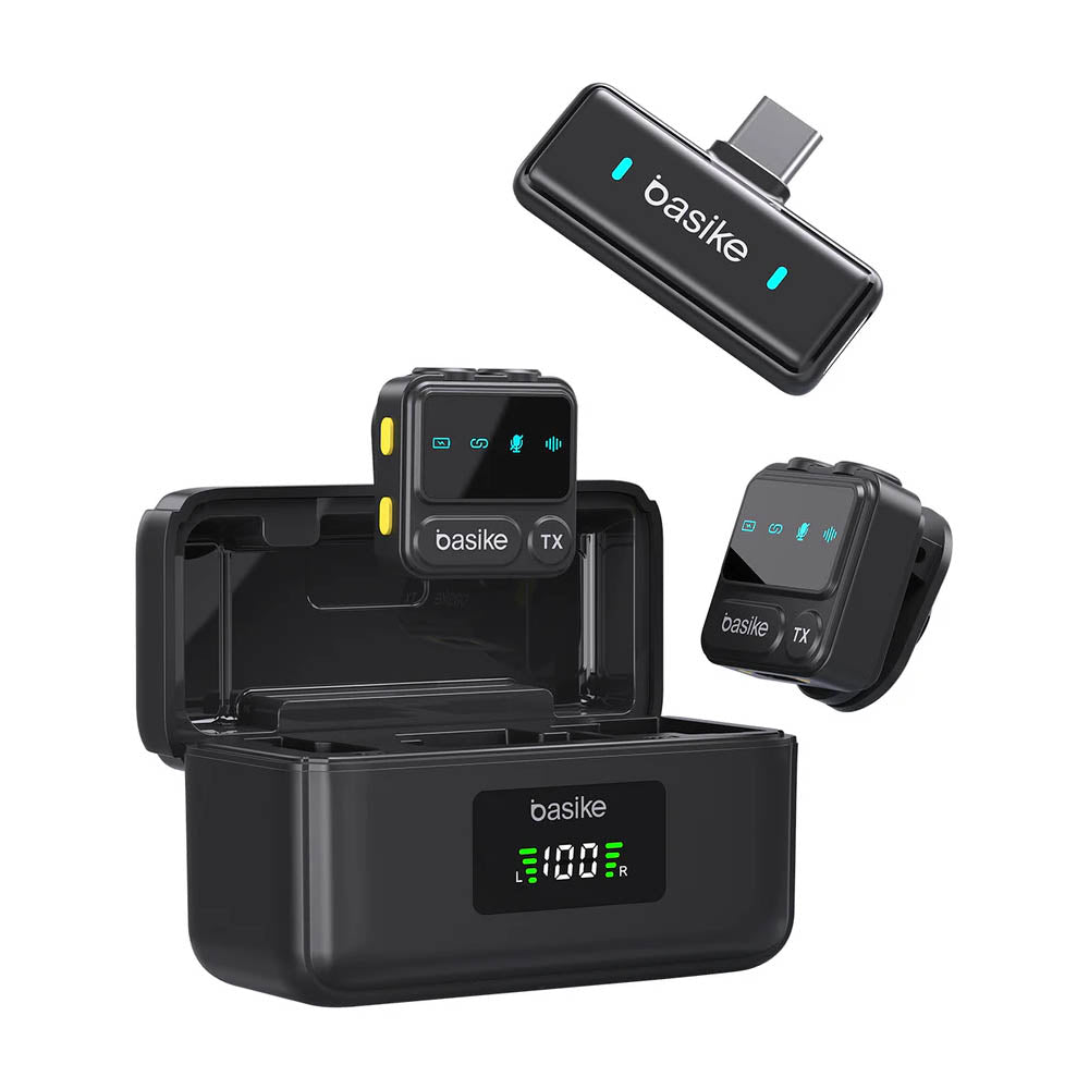 Microfone Sem Fio Wireless Lapela Tipo C Basike a Prova de Vento C/ 2 Microfones e Base de Carregamento