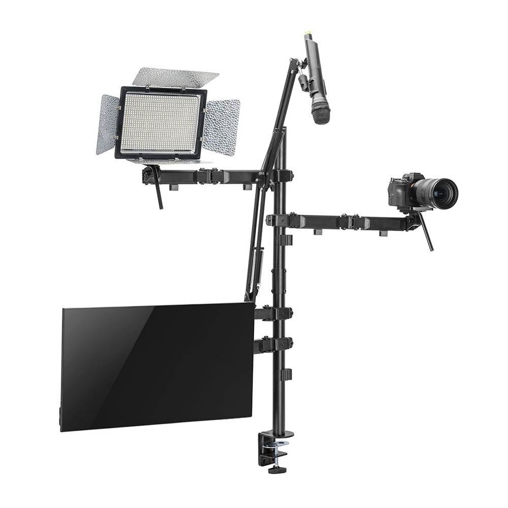 O suporte de mesa All-in-One Studio Setup SE-MDS1041 é a ferramenta essencial para YouTubers e outros criadores de conteúdo. Usando um único poste “para governar todos”, o usuário pode criar uma árvore de câmeras, iluminação, monitores, microfones e muito mais. Feito em aço resistente, o mastro e a base suportam com segurança todo o equipamento, enquanto os braços e acessórios ajustáveis permitem total amplitude de movimento. Dois suportes para fixar luzes, câmeras ou adaptadores de telefone/tablet com parafusos de 1/4'' e 3/8''. Uma alça de posicionamento facilita os ajustes e sem interrupção durante as sessões de gravação. Duas opções de montagem para microfones com a unidade de fixação estão incluídas no pacote. O braço do monitor cabe em telas de 17" a 32" e oferece inclinação e rotação sem esforço para encontrar as posições de visualização.