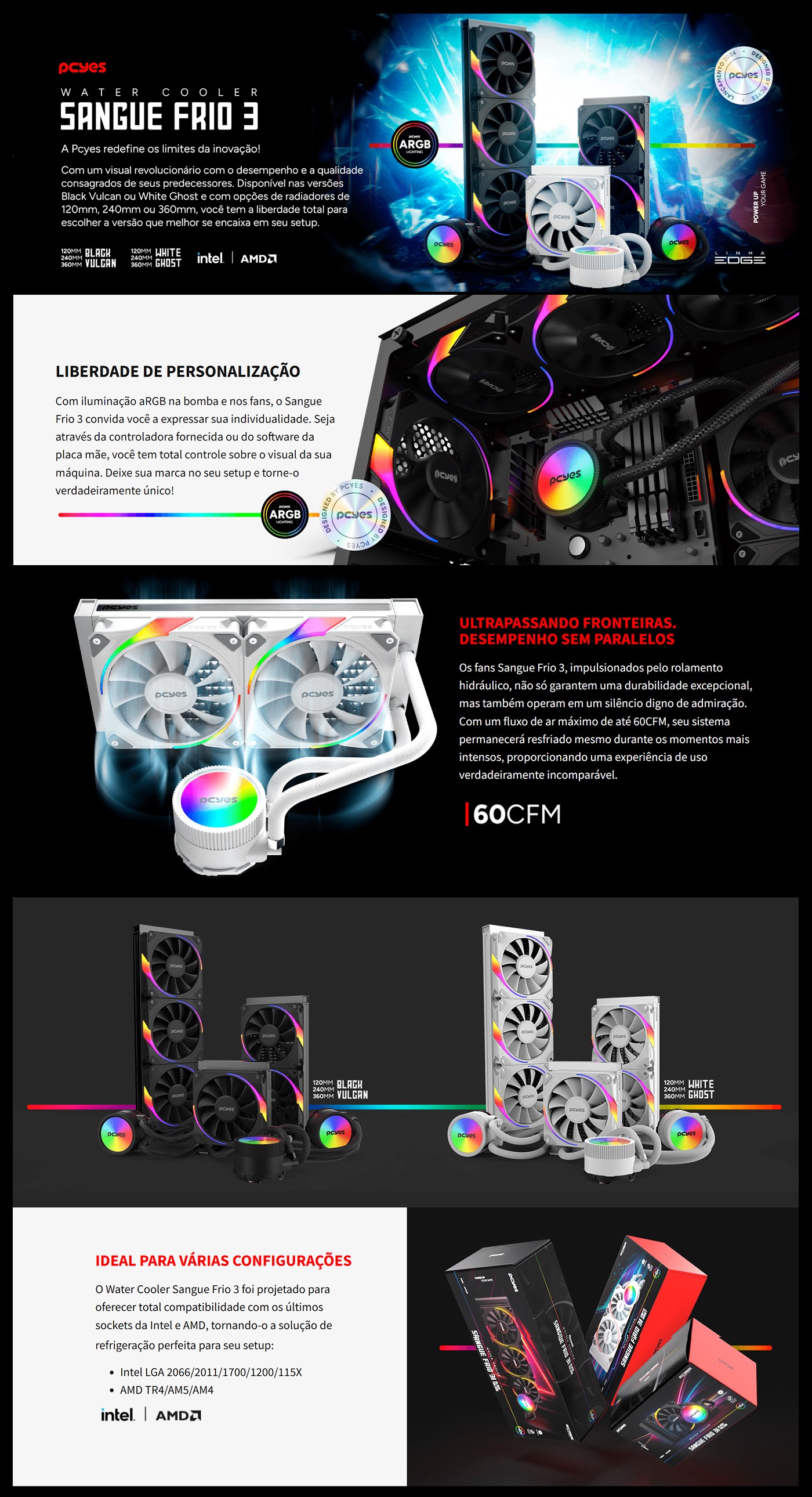 Marca:PCYES Modelo:ARGBSF3240WGBR TDP:250W Dimensões do Radiador:277×120×27mm Material do Radiador:Alumínio Material da Chapa Fria:Cobre Compr...